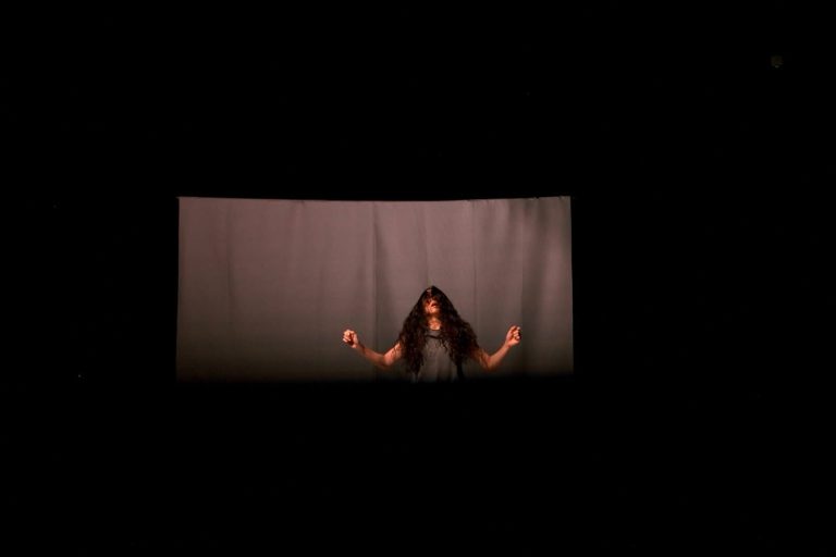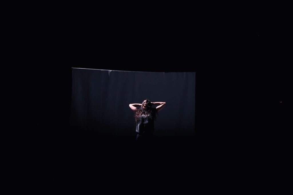 最初的配置呼應著整個創作的起心動念——田孝慈背對觀眾走在舞台的邊角,面朝上舞台的椅子,燈光聚焦——一個反身向內的檢視。接著她轉過身,上下左右緩慢擺動頭部,並從這刻起直勾勾地盯著正前方的觀眾席,將我們的觀看「反彈」回來。事實上那並不是一個太舒服的經驗,我幾乎是在感受到視線的瞬間就觀察到自己進入輕微的警戒狀態——下意識地,我調整了一下坐姿,把頭擺正。