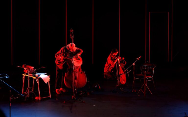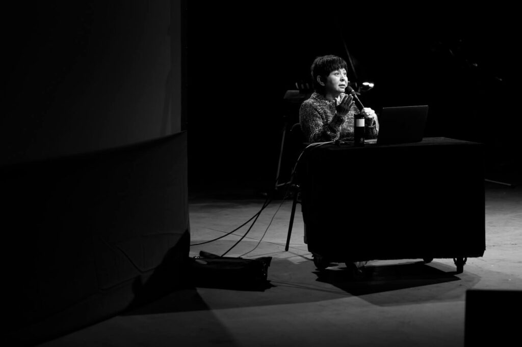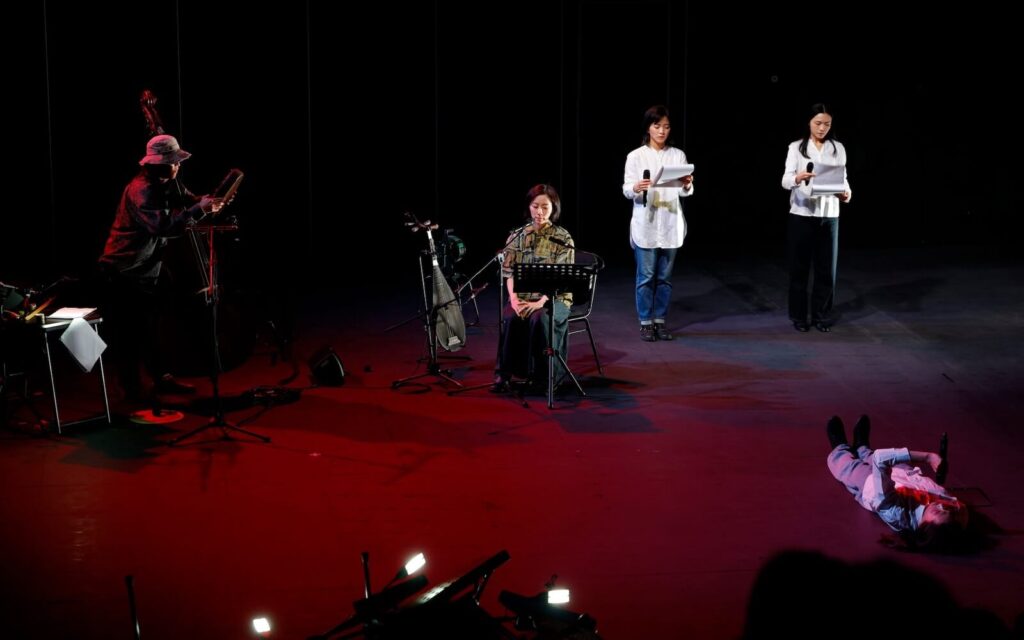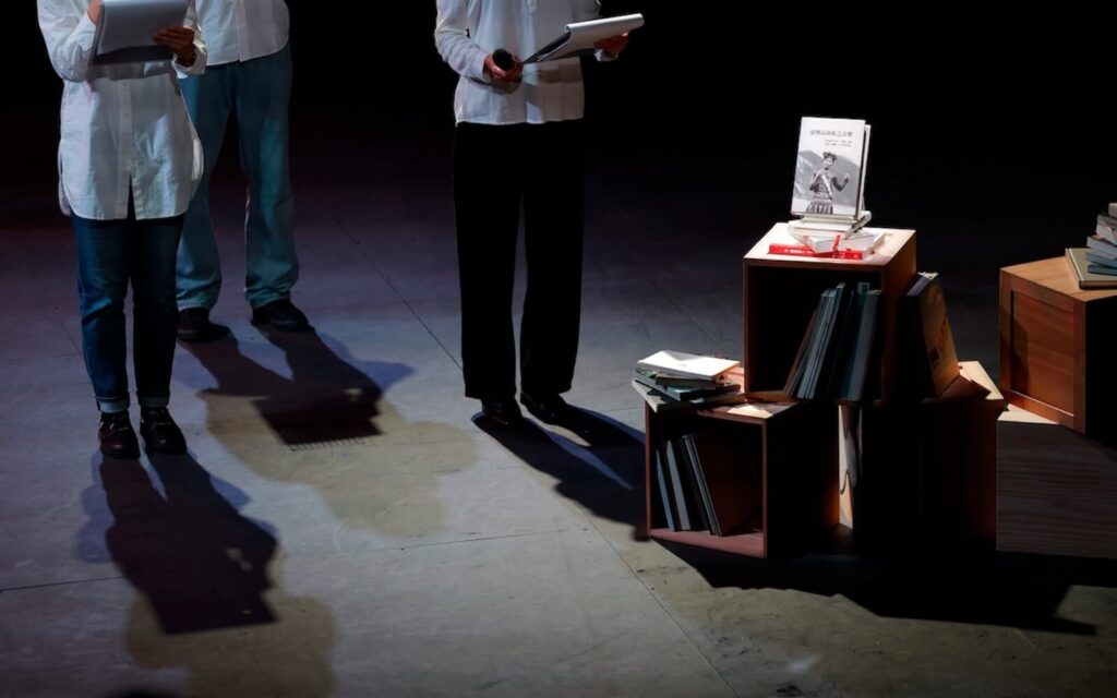 表演一開始,由坐在舞台後方的兩位音樂表演者率先現聲。音樂創作者李東熙藉著敲打、撥弄琴弦,製造出具高低變化、質地差異的聲響;配合另一位音樂表演者的人聲伴奏,為朗讀的文本烘托出一套場景與情緒。在開篇的一連串低音後,朗讀者順勢加入,正式進入黑澤的踏查日記。朗讀者身穿白衣、牛仔褲,以兩位女性和一位男性這樣的組合分別站在舞台兩側,以日記的篇章為單位,兩組輪流朗讀文本。兩組一來一往、時而重疊的朗讀聲,搭配上樂器的聲響,創造出一種類似合音的效果。令人印象最為深刻的場景是,演出進入尾聲,男表演者躺臥於舞台右側,另外兩位朗讀者也移動至他後方,燈光打在他的身上,製造出如海水波紋蕩漾。文本朗讀還是維持著有來有往的節奏,但「躺著」的肢體,卻讓語句的表達比先前多了一點戲劇性,吸引觀眾關注他的肢體與表情,尋找語言以外的訊息。這個段落亦是展演情緒最高漲之處,最終收結於朗讀者的低語,模糊了「讀」與「演」之間的界線,留下長長餘韻。
