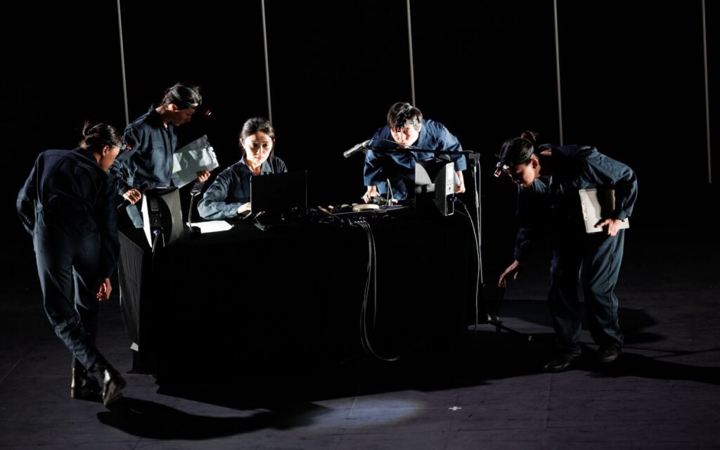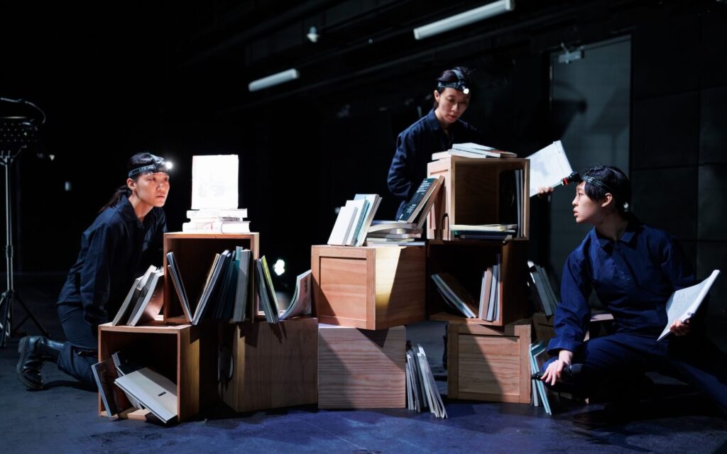 本場的朗讀者們穿著灰色連身工作服、頂著頭燈,全身的打扮都呼應了「山中探勘」的主題。表演一開始,音樂創作人許雁婷坐在舞台中央播放電子聲響,打扮成探勘隊的朗讀者們在她身邊圍成一圈、半蹲著。直到第二輪音樂響起,這些探勘隊才隨著節奏,緩緩繞行音樂控制台。繞行半途中,朗讀者們魚貫離開中心圓的軌道,聚集至舞台右側的書櫃四周,以攀附山壁的姿勢,開始朗讀文本。由這前三分之一的表演就能感覺到,對照同樣以「踏查/探勘」為主題的第二場《臺灣高砂族之音樂》,《山、雲與蕃人》的演出明顯更為動感,表現形式也更接近戲劇。從表演者的服裝開始,朗讀者有時蹲、有時站的肢體動作,帶出垂直的空間差;走位上,從中心轉移至側邊、以及圍繞特定物件的安排,則在水平空間上創造出不同分區;燈光也會隨著朗讀者與音樂,調整明暗與位置。這些不同的舞台元素相互結合,共同在舞台上營造出一種立體的、身處山林的空間感。