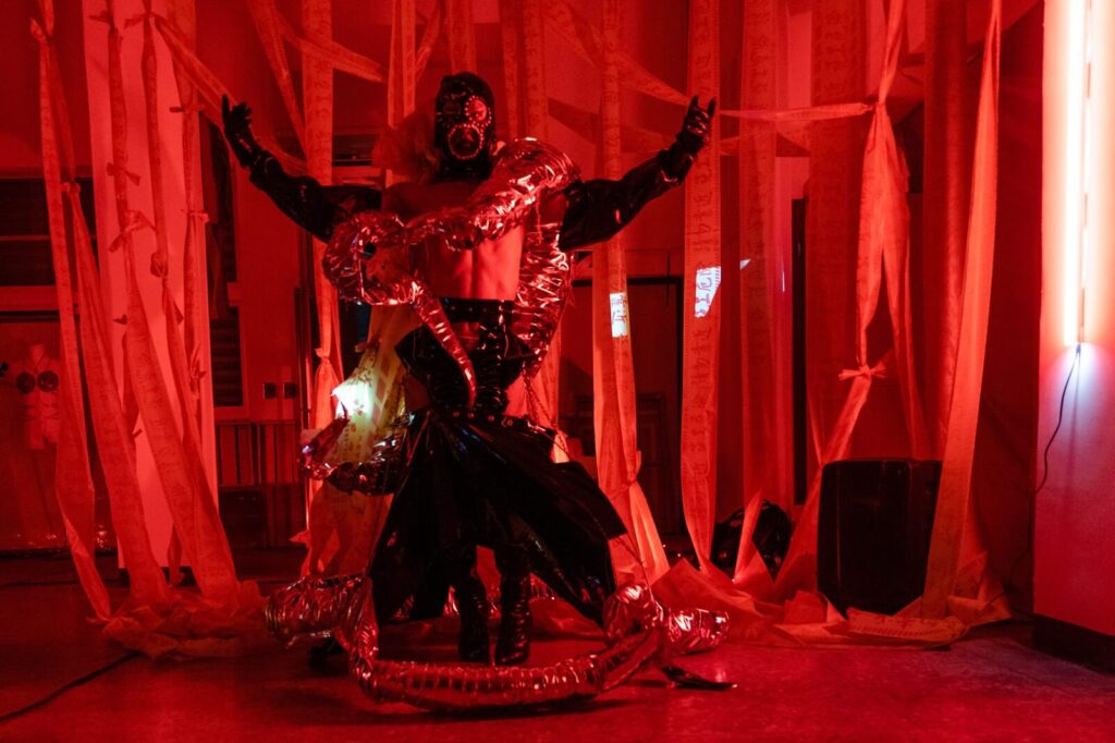 2023年他入選阮劇團DQ創作計畫,在嘉義駐地創作並發表了作品《半閹娘仔》。這個名稱意指男體女態者,出於計畫共同發展文本的表演者沈建緯的成長故事,創作過程兩人互相分享與挖掘各自來自於性別的生命經驗與疼痛,並將這些刺痛的記憶轉化成以變裝烏托邦為題的派對。視覺方面,他運用了許多台灣在地元素與生活中的日常物件,透過現成物的拼接與拆解,重啟大眾對於物件美學的視覺想像,以及其符號意義的重新詮釋。近年這兩件作品,他皆將成長的痛感轉化為變裝創作的材料,並在過程中逐步修復關係、與自我和解,因而得以成為今日更加理想的自己。